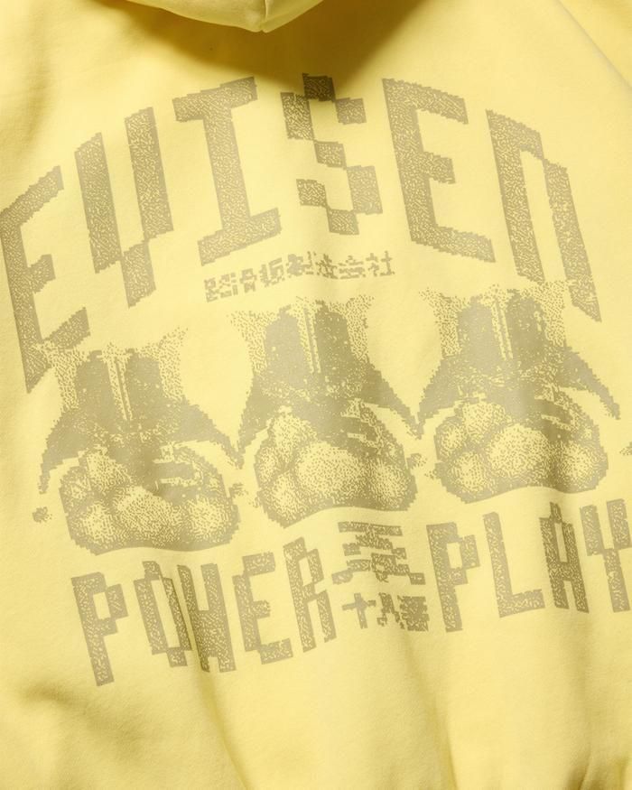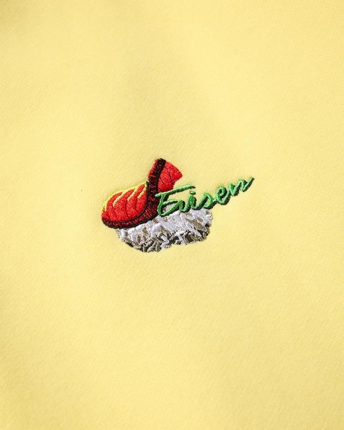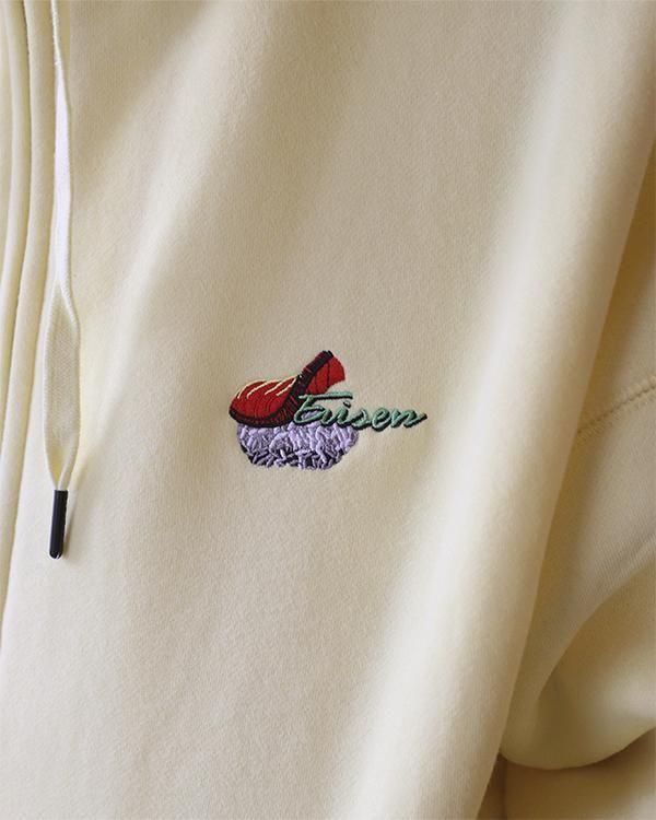 左胸にワサビ色のEvisenロゴ入り寿司刺繍、フロントにカンガルーポケットを配置。