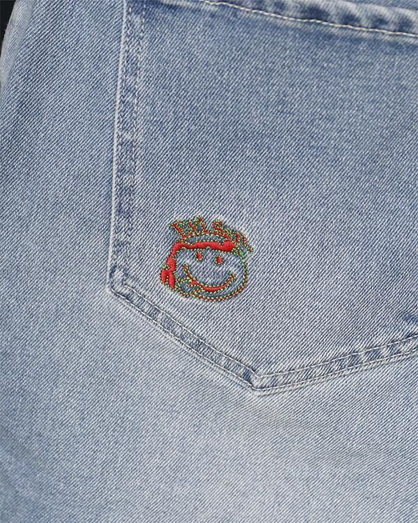 ウォッチポケットにはEvisenのロゴ刺繍、左側バックポケットには酔っ払ったニコちゃん刺繍入り。