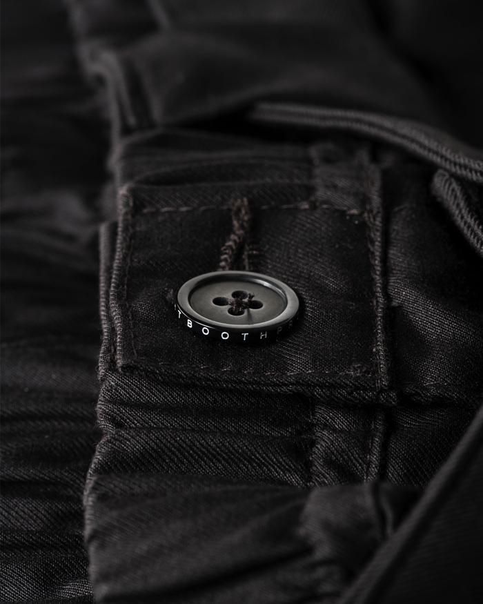バックの右腰部分にはロゴ入りのヌバック風パッチ付きで、ボタンもロゴ入りのものを使用。