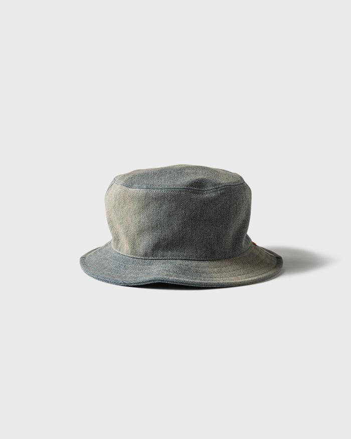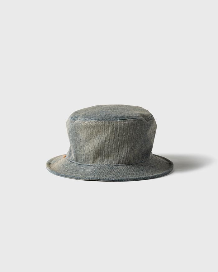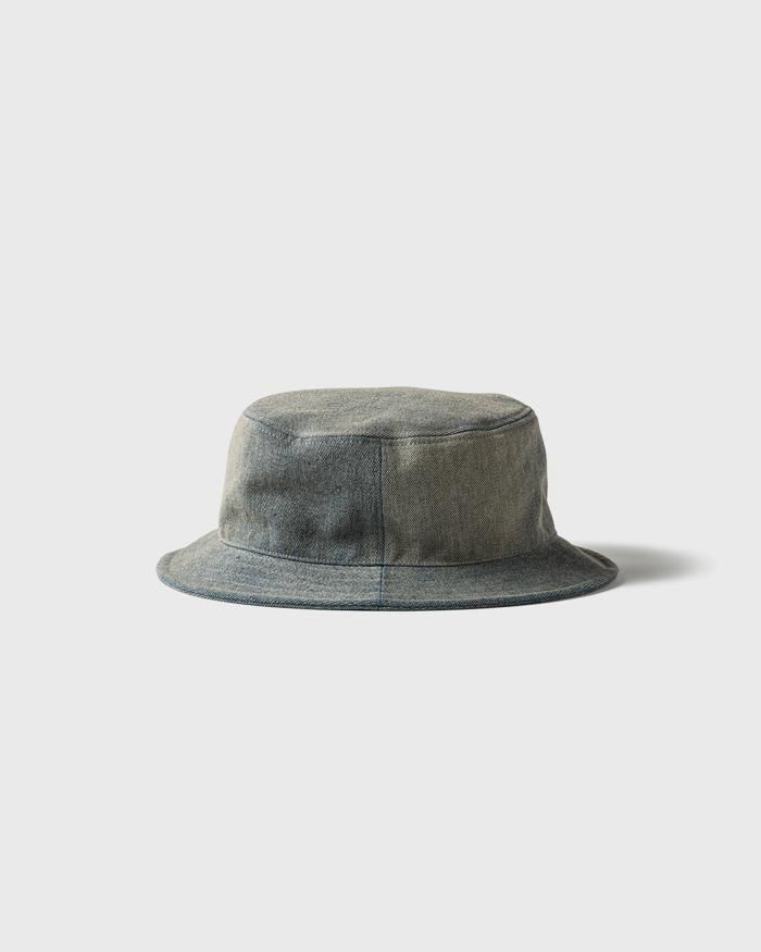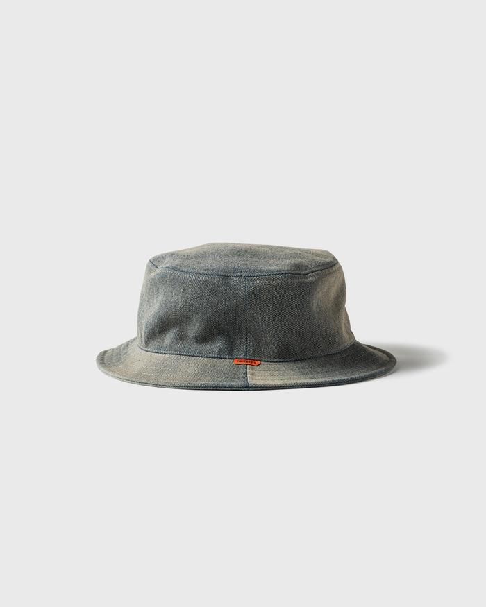 洗いに加え、部分的にオーバーダイ加工を施したデニム生地のバケットハット。