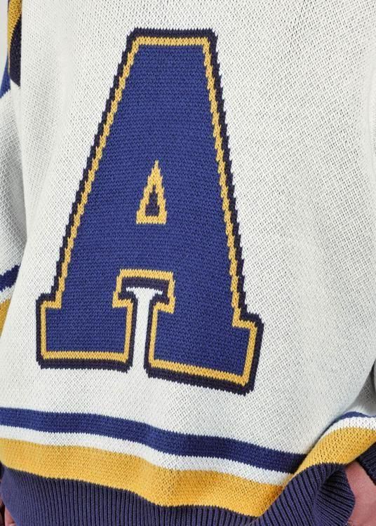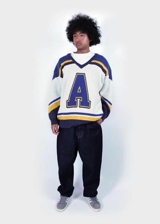 ホッケーシャツを大胆にジャガードニットで表現した一枚。