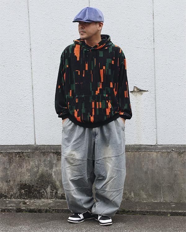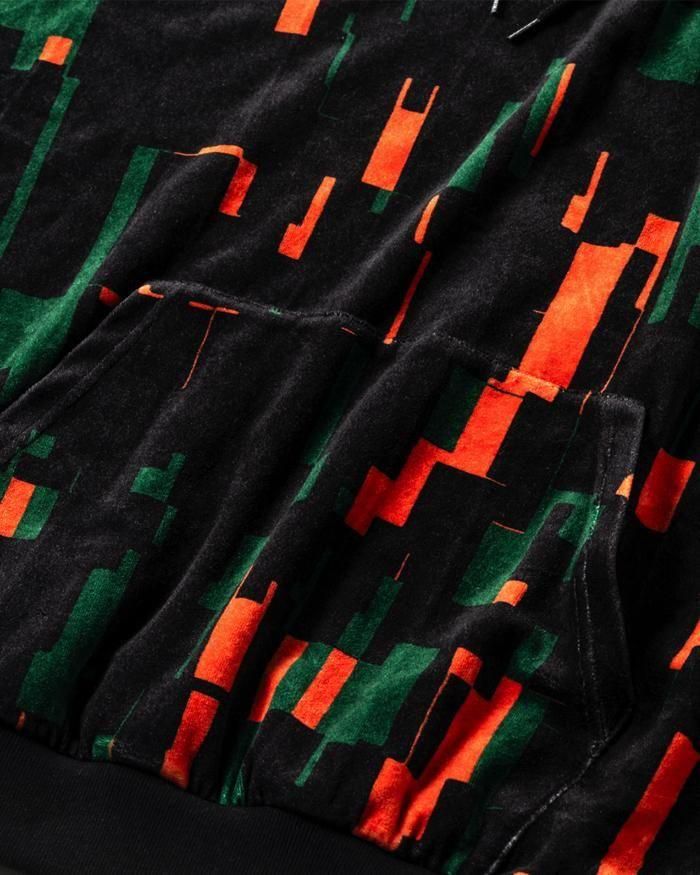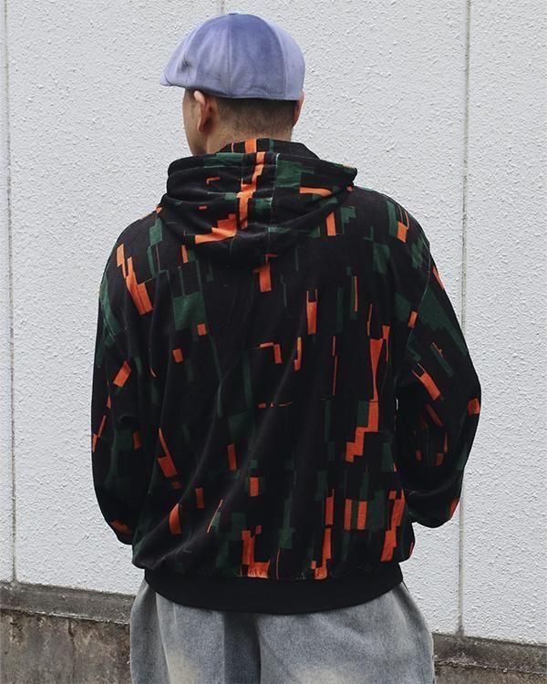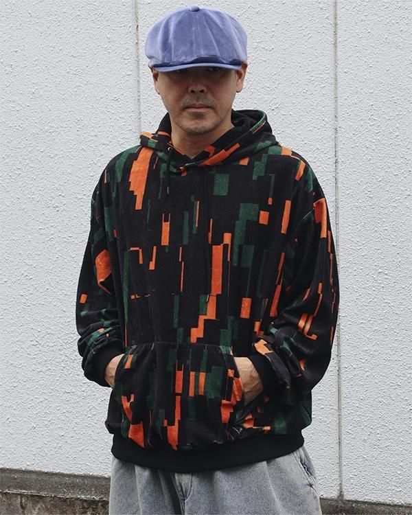 定番のベロア生地に総柄プリントした、ワイドシルエットのプルオーバーフーディ。