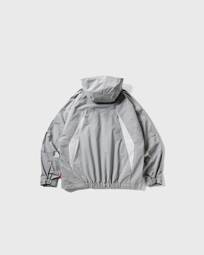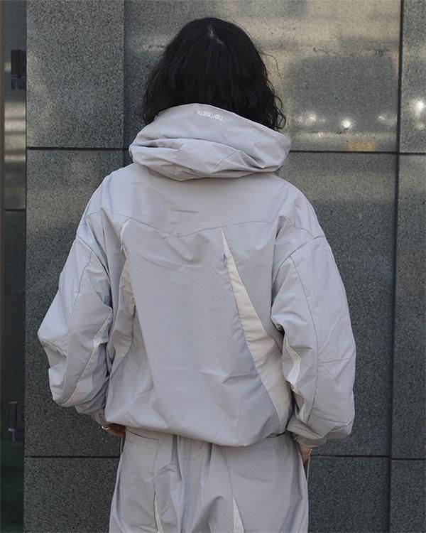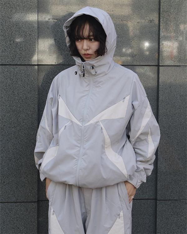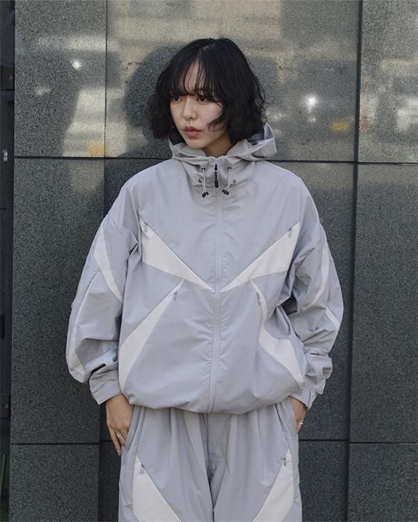 トライアングルの切り替えデザインを施したフード付きジャケット。