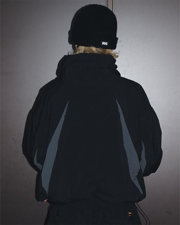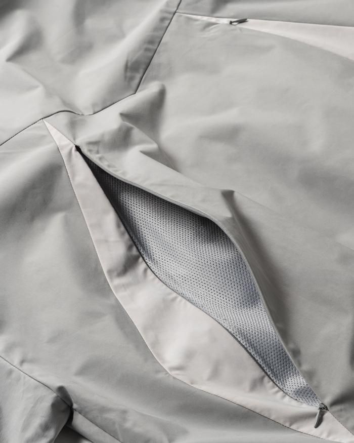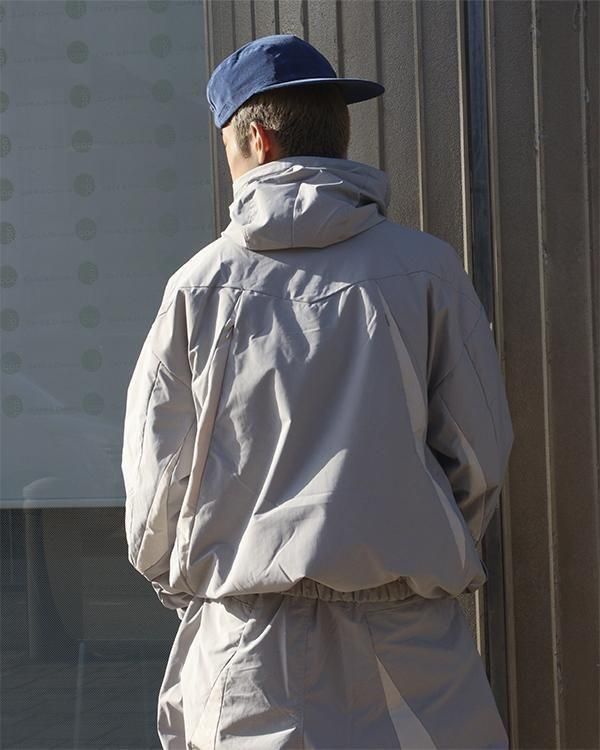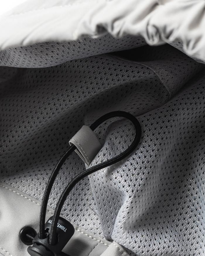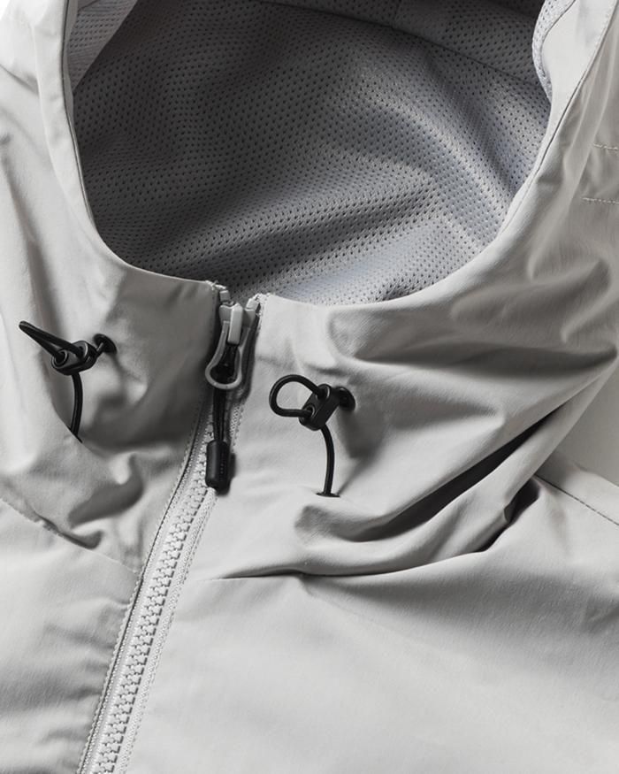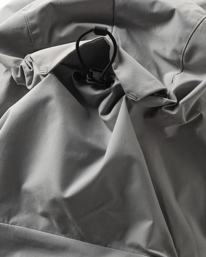 フードには顔まわりだけでなくの後頭部付近にもドローコードを巡らせ細かなフィット感の調整が可能。