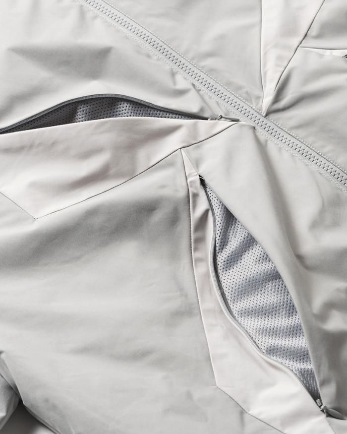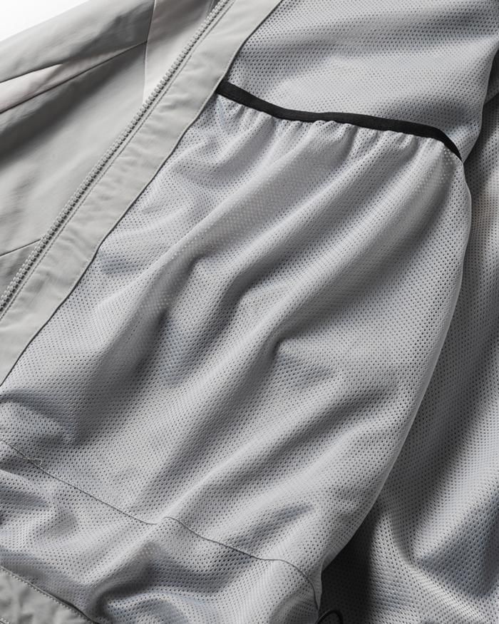 高密度で柔らかく、マット感のある超微起毛ポリエステルウェザー生地を表地に採用し、裏地はメッシュ素材でさらりとした着心地。