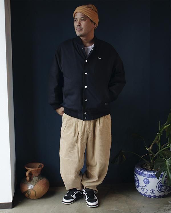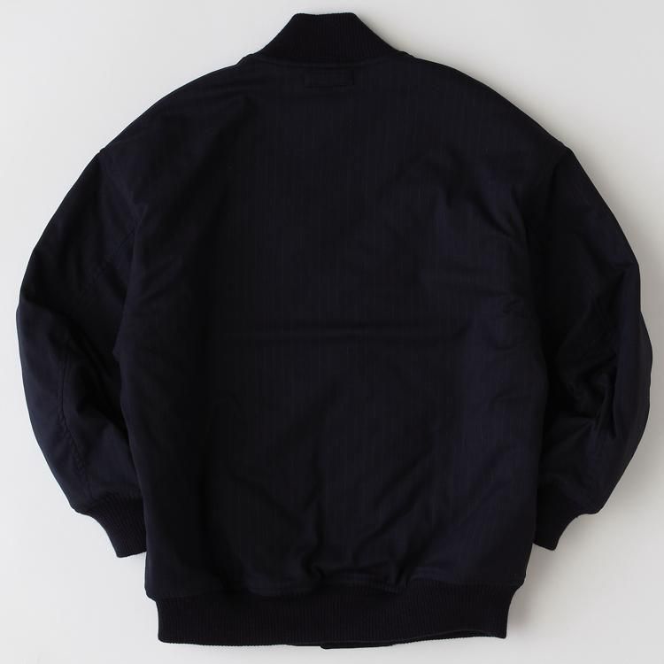 適度な肉感のT/Rツイル素材を使用したスタジアムジャケット。オーセンティックなリブ衿仕様とストライプパターンは、いつもとは一味違った落ち着いたコーディネートを楽しめるアイテム。胸のロゴ刺繍とソリッドなフラットボタンが程よいアクセントを与えてくれる。