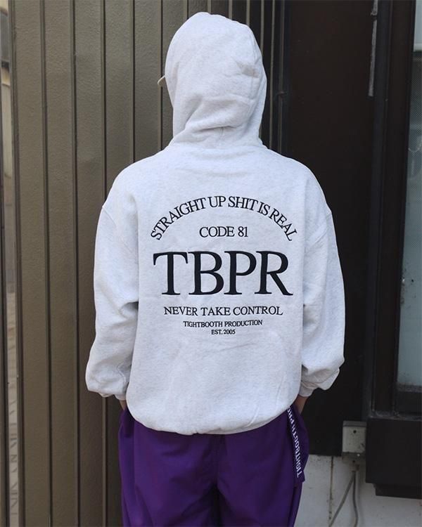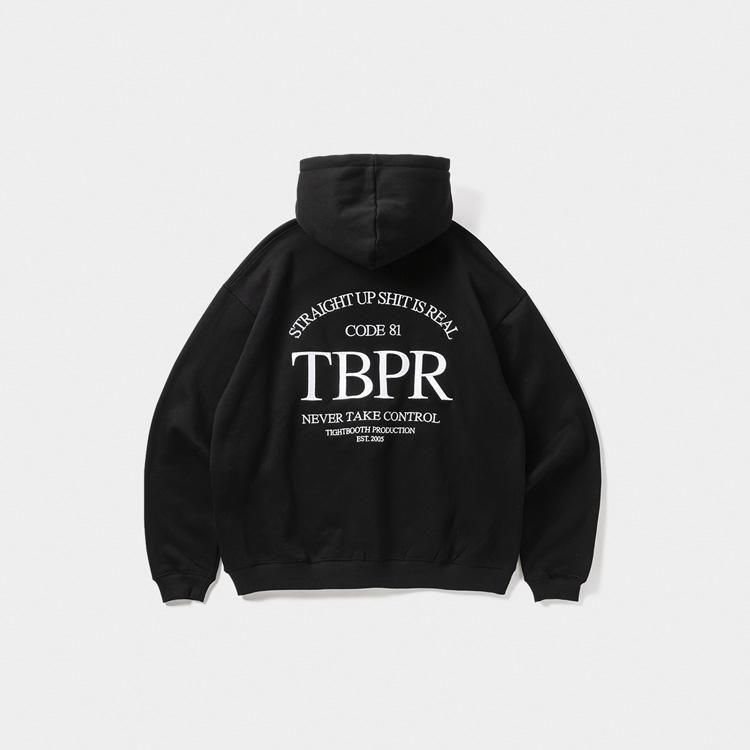 前身頃のカンガルーポケットをくぐるようにTIGHTBOOTH PRODUCTIONの文字を曲線状に刺繍。