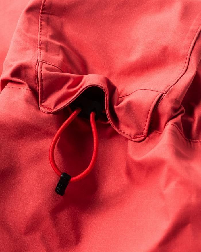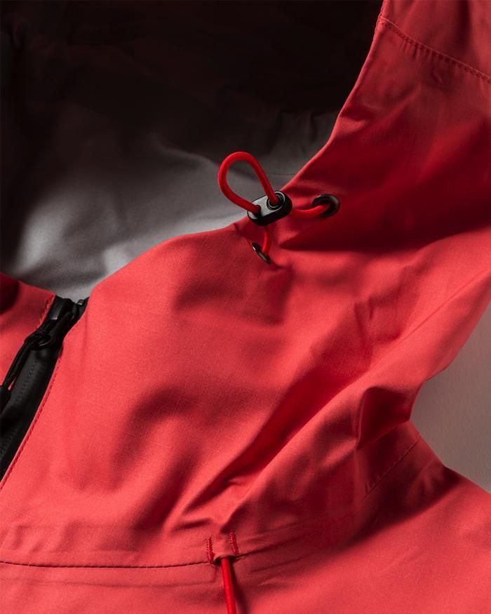 フードには顔まわりだけでなくの後頭部付近にもドローコードを巡らせ細かなフィット感の調整が可能。
